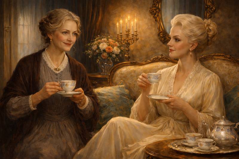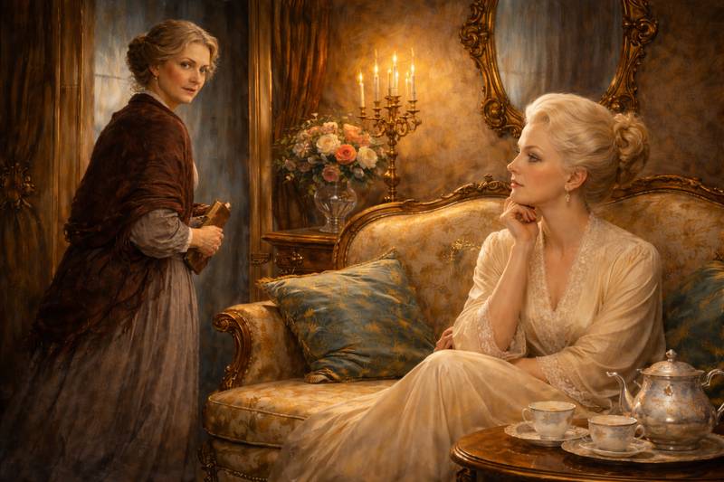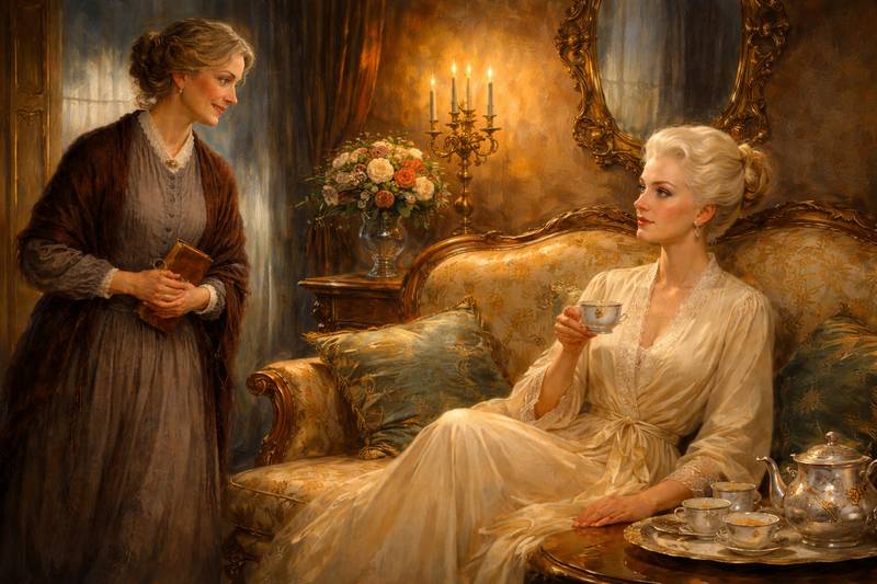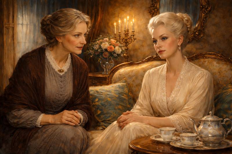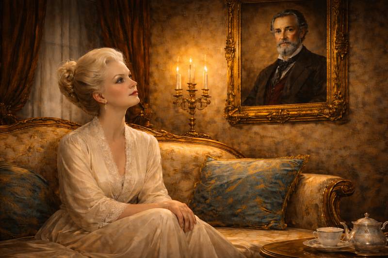 Lady Hedwig egy karosszékben ült, vörös szaténköntösében, haját kifésülve. Arca tökéletesen festett, de tekintete fáradt volt – azonban túl éber ahhoz, hogy nyugodt legyen. Egyetlen olajlámpás égett a sarokban, mint egyetlen tanú a félhomályban.