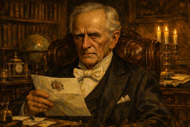 Az idős lord a szalon ablakán keresztül látta, hogy a ház előtt várakozó hintón az uralkodói ház címere van, amelynek látványa minden brit állampolgárt mély tisztelettel, de némi feszültséggel tölt el, így néma és mély meghajlással fogadta látogatóit, de a bizonyos harmadik úr csak némi fejbiccentéssel köszöntötte, akárcsak társai.