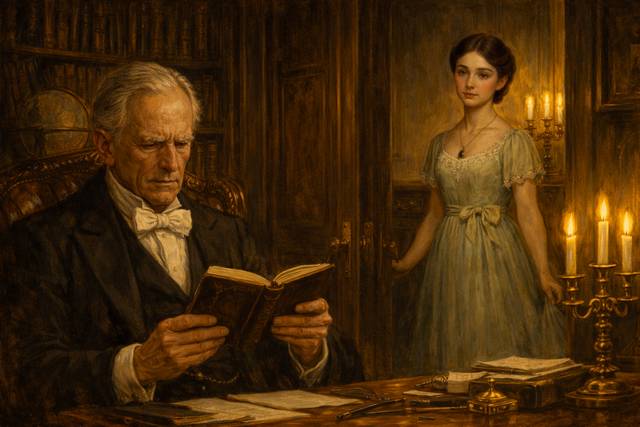 A lord az emlékek súlyától elnehezülve lassan kihúzta az íróasztal alsó fiókját, amelyből egy személyes naplót vett elő, majd kinyitotta és néhány pillanatnyi lapozás után megállapodott egy sűrűn teleírt oldalnál, amelyet a szemeivel átfutott, majd a napló végére lapozott, ahol egy rézkarcon az a kép volt látható, amely az imént megjelent a lelki szemei előtt.